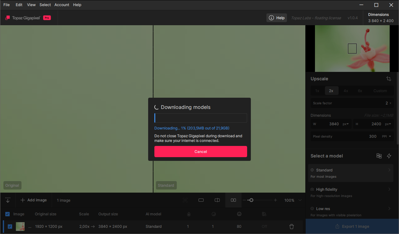 Topaz Gigapixel 1.0.4 после установки при первом запуске выдаёт сообщение «Initializing... Hold оn for а moment while the application is being initialized. Please do not close Topaz Gigapixel». Это сообщение висит бесконечно долго и не даёт возможности пользоваться программой. Статуса загрузки моделей нет. Я прождал три с половиной часа — программа так и не запустилась. Хотя у меня нормальный интернет 900 Мбит. Версия 8.4.4. работает при этом нормально. При первом запуске идёт загрузка моделей с отслеживаемым статусом, а потом можно полноценно пользоваться программой. А начиная с версии 1.0 и выше (включая 1.0.4) программа просто не работает уже.