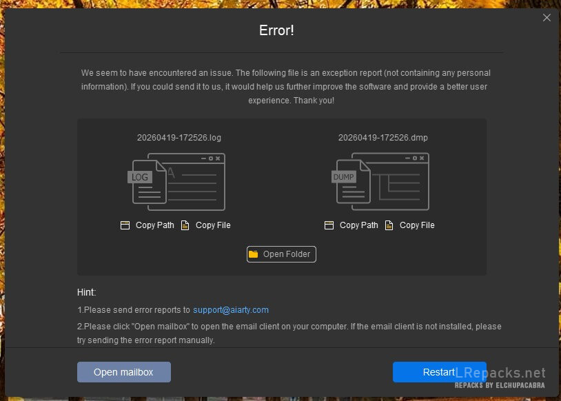 Теперь при любой попытке запуска программы выскакивает сообщение и программа принудительно закрывается. Сообщение такое: The software encountered а fatal error and will close. Error information: