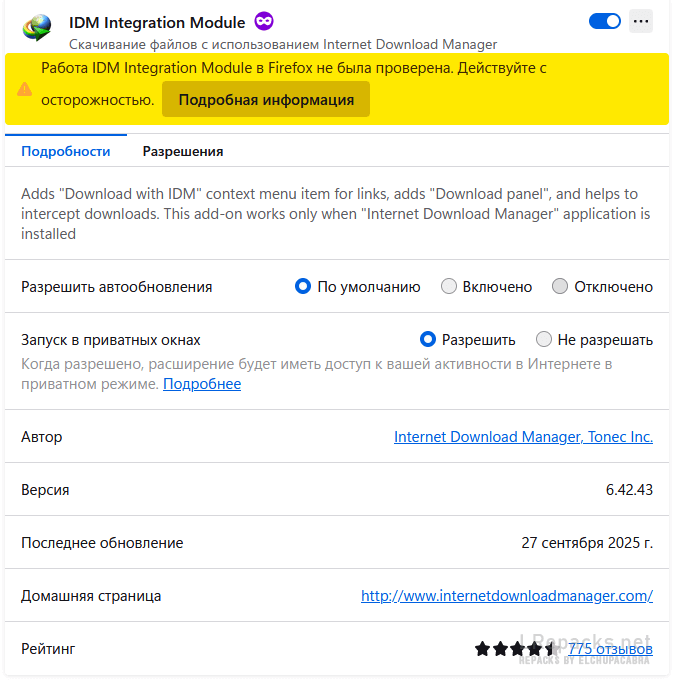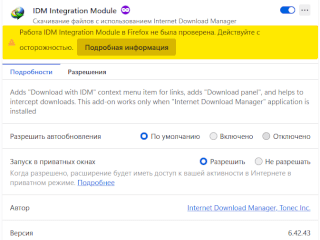 А из дистрибутива IDM вы расширение на обычную версию Firefox не установите. Разработчики не отправили эти расширения (там их 3 варианта) на подпись разработчикам Firefox, поэтому защита не даст их установить.