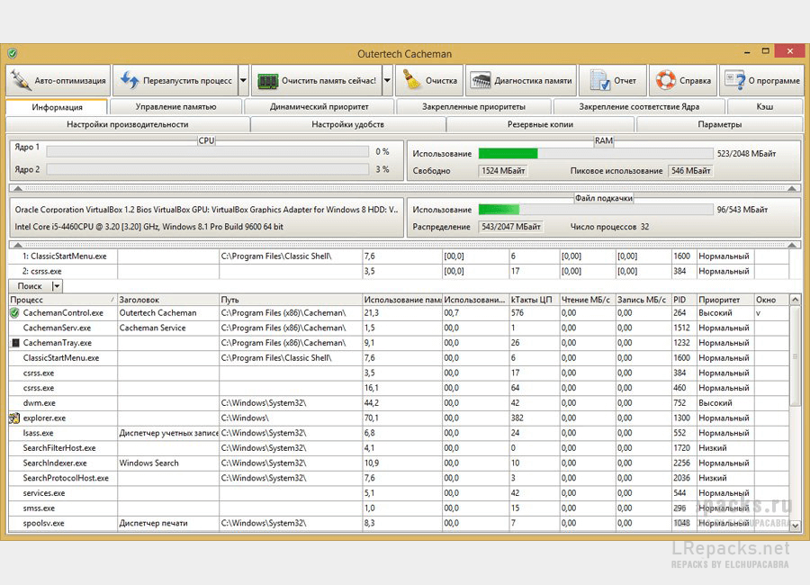 Cacheman (Repack & Portable) - небольшая утилита, предназначенная для оптимизации операционных систем семейства Windows, которая увеличивает скорость и стабильность работы ПК, оптимизируя кэши, освобождая оперативную память и тонко настраивая множество параметров системы.