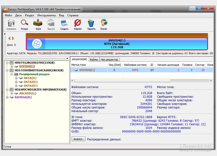 Eassos DiskGenius /ex. PartitionGuru/ (Repack & Portable) - программа для управления разделами жесткого диска, которое умеет создавать, изменять размер, форматировать, удалять разделы диска. Стоит выделить несколько полезных функций, таких как восстановление данных в разделах, набор опций по операциям с файлами и резервное копирование, которые помогут сохранить Ваши данные.